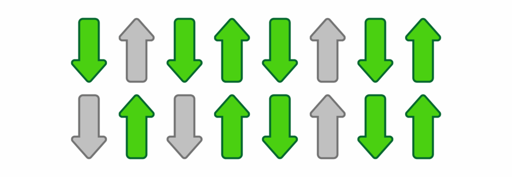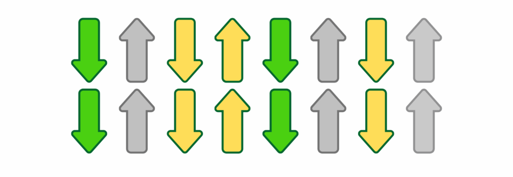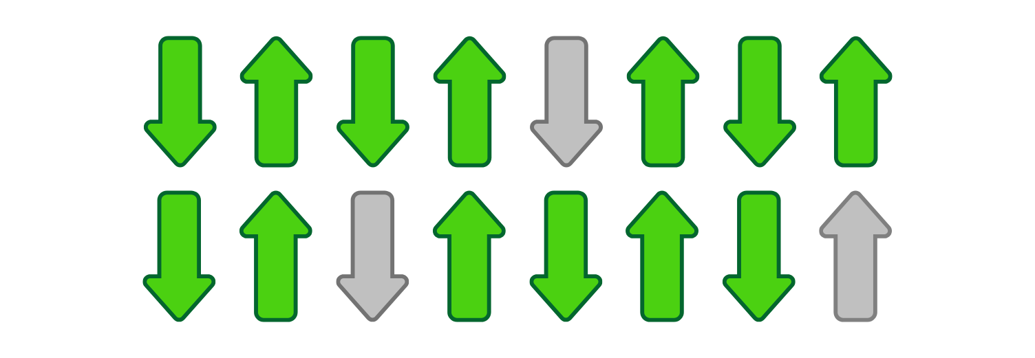 Ogni diagramma presenta due file di otto frecce ciascuna, per un totale di 16 frecce. Questo rappresenta una battuta di 4/4, dove ogni freccia vale un sedicesimo.