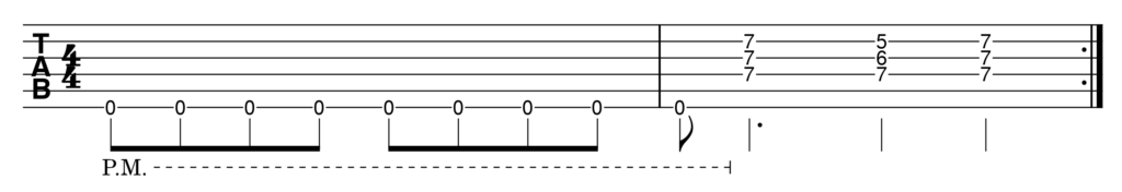 Anche in questo caso ho preparato la tablatura (TAB – clicca qui se non sai come leggerle) del riff che puoi sentire fin dall’inizio del brano: l’esecuzione in palm muting e downpicking (plettrata in giù) è uno degli esempi di proto-metal presente nella discografia dei Led Zeppelin fin dai loro inizi!