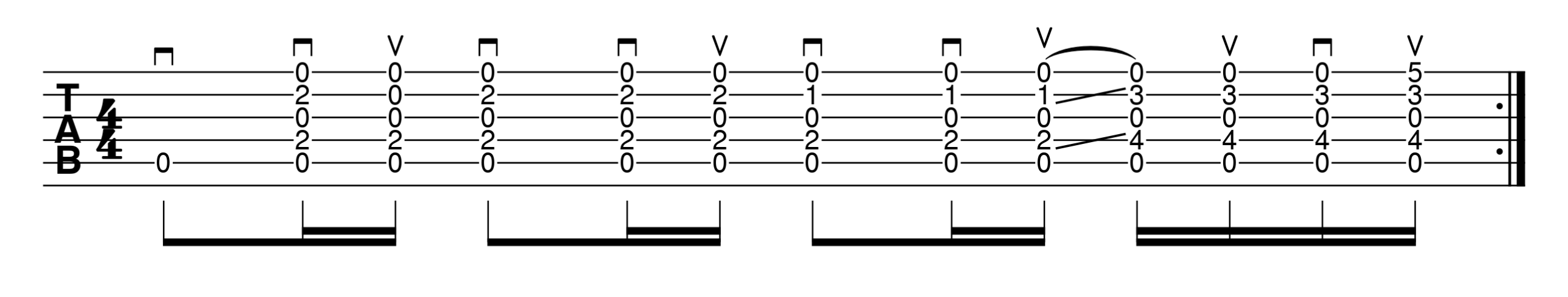 Se hai voglia di “lasciarti andare” con la tua chitarra acustica, ecco la tablatura (TAB – clicca qui se non sai come leggerle) della ritmica che puoi sentire già all’inizio del brano. In alto troverai l’indicazione di ogni pennata: quella in giù è indicata dal “trattino con le gambe”; mentre quella il su è indicata dalla “V”.
