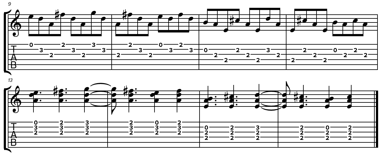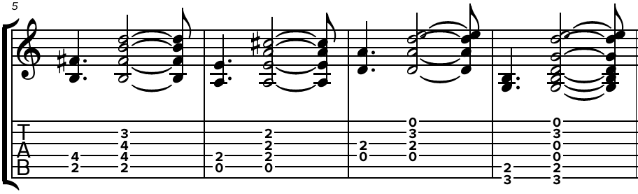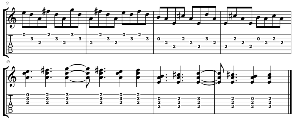La ritmica del ritornello prevede una progressione di quattro accordi, dunque SI minore, LA maggiore, RE maggiore e SOL maggiore. Sul RE e sul SOL, è possibile usare il MI cantino a vuoto per ottenere rispettivamente un REadd9 o un SOLadd13, mentre nel caso del LA, liberare e suonare a vuoto la corda del SI ci consente di avere un LAadd9.