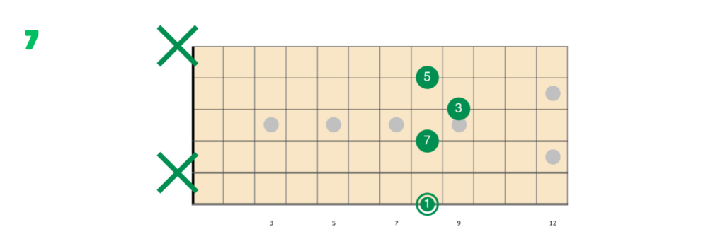 Anche qui, come è facile immaginare, sarà semplice passare dal 7 al min7. È possibile eseguire questa diteggiatura posizionando indice, medio, anulare e mignolo all’VIII tasto delle corde d MI, RE, SOL e SI; o posizionando il medio all’VIII tasto della corda di MI e utilizzando l’anulare per eseguire un mini barrè allo stesso tasto sulle corde di RE, SOL e SI.