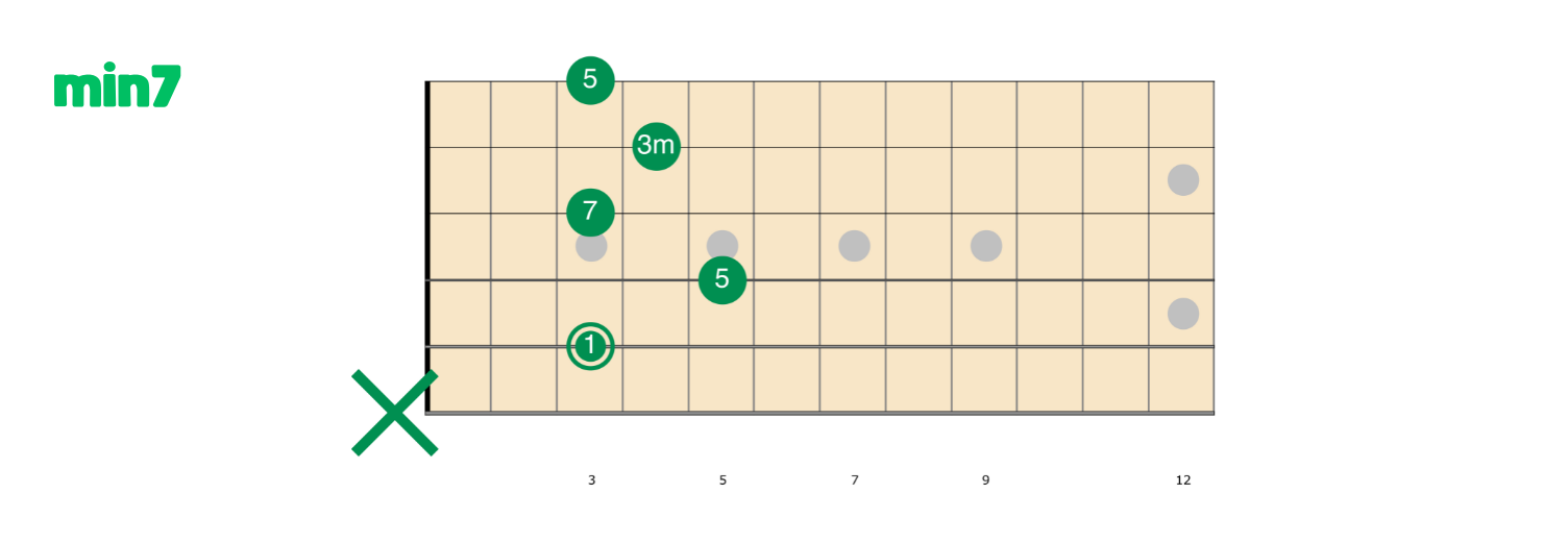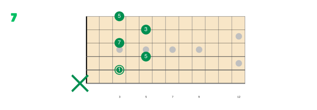 Anche in questo caso, da 7 a min7, sarà sufficiente modificare un grado, il 3, che passerà dall’essere maggiore a minore. In questo caso elimineremo il mignolo dalla diteggiatura, posizionando invece il dito medio al IV tasto della corda di SI.