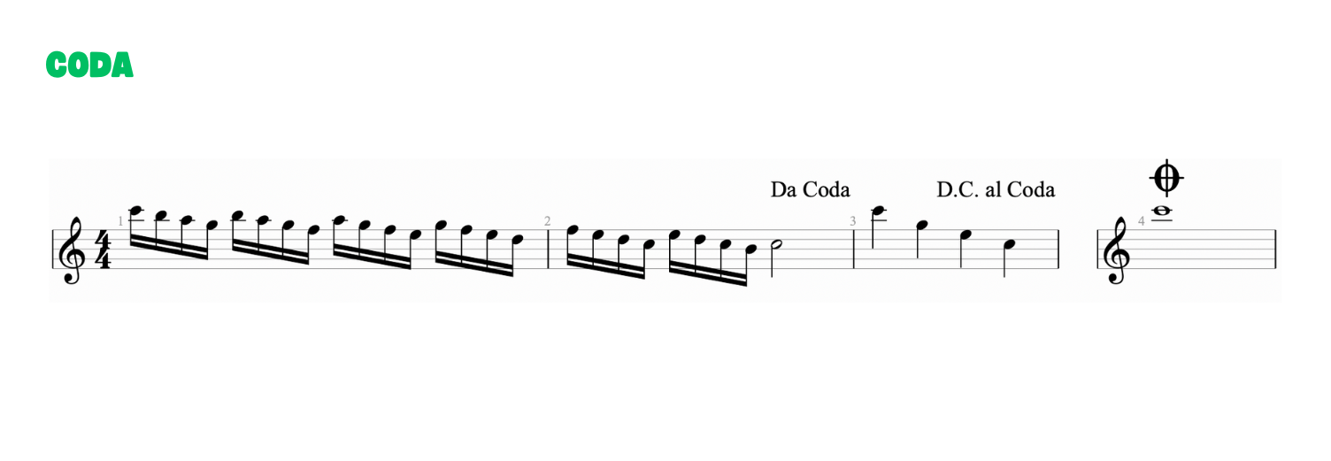 Coda: Questo simbolo (spesso un cerchio con una croce all’interno) indica un salto ad una sezione finale o una parte conclusiva del brano. Si suona fino a un punto indicato “Da Coda”, e da lì si salta direttamente alla sezione contrassegnata dal simbolo della Coda, saltando le battute intermedie. Questo è utile per creare sezioni alternative o finali abbreviati.