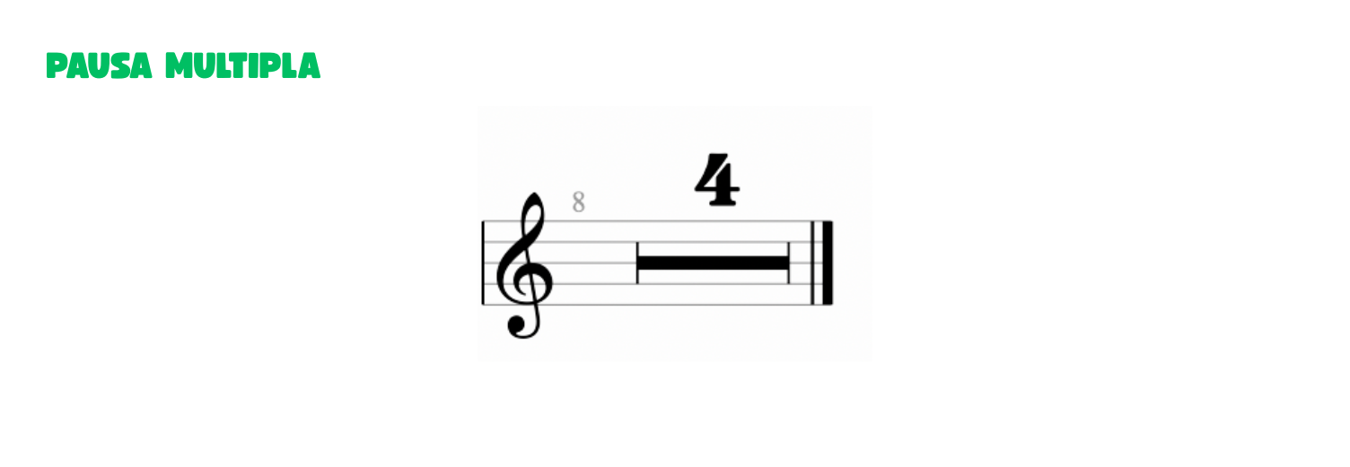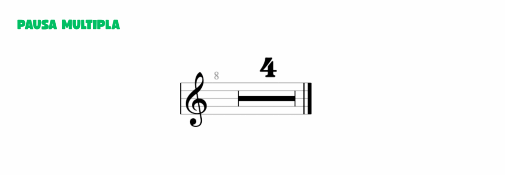 Pausa Multipla: Questo simbolo permette di indicare una pausa lunga per più battute, occupando lo spazio di una sola battuta sullo spartito. Ad esempio, un simbolo con un numero “4” sopra indica quattro battute di pausa. Questo ottimizza lo spazio e la chiarezza visiva.