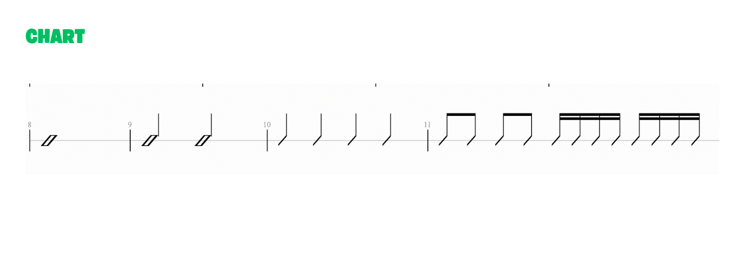 Per i chitarristi, sono inclusi anche i simboli delle plettrate (downstroke con un simbolo a “tavolino” e upstroke con una “V”).