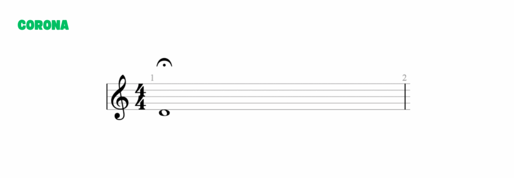 La corona è un simbolo grafico che assomiglia a una parentesi rovesciata con un puntino sotto. Questa indicazione ci dice che la nota (o la pausa) su cui è posta deve essere eseguita per una durata maggiore rispetto al suo valore nominale, senza un tempo preciso predefinito.