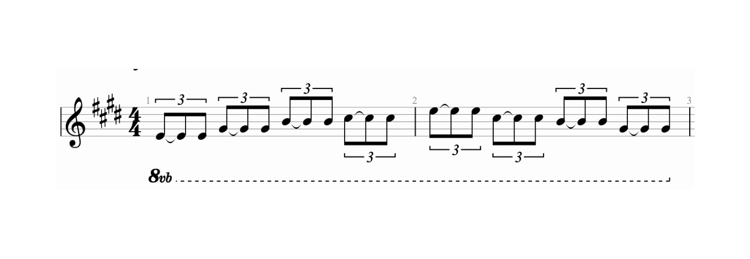 Esercizio con Terzine e Ottava Bassa (8VB): Questo esercizio presenta terzine di ottavi, con una legatura di valore, e un’armatura di chiave con quattro diesis (che indica la tonalità di Mi maggiore).