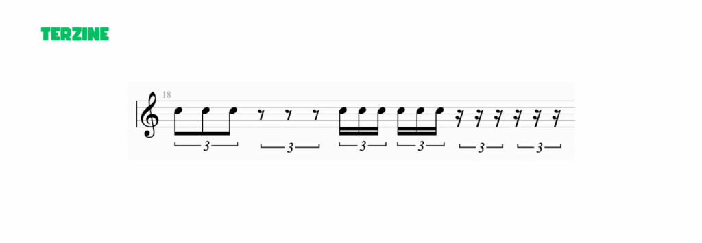 - In un quarto, solitamente, troviamo due ottavi. Con una terzina, inseriamo tre ottavi. Graficamente, questo è rappresentato da una parentesi quadra con un “3” sopra le tre note, che possono essere suonate o in pausa.
