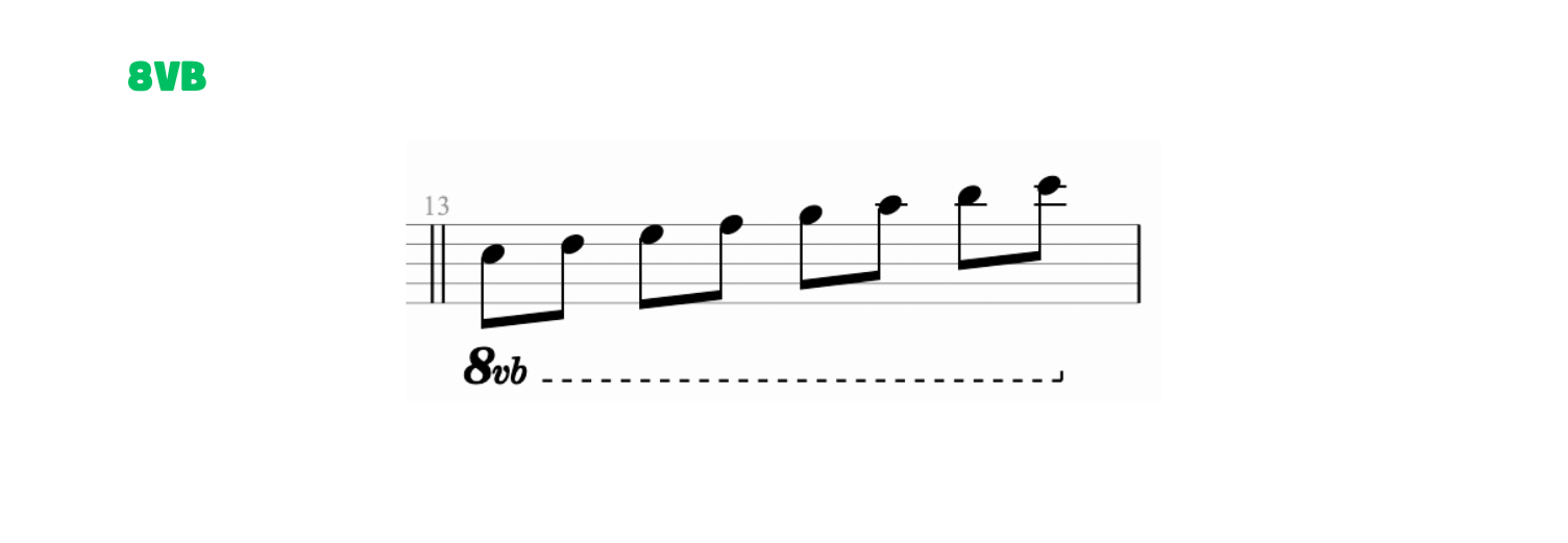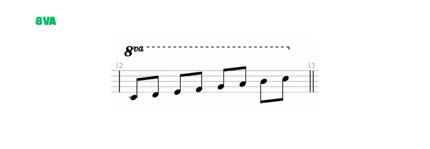 Per facilitare la lettura quando si incontrano molti con tagli addizionali, esistono i simboli di ottava. Questi simboli indicano che le note scritte devono essere suonate ad un’ottava differente da quella indicata graficamente.