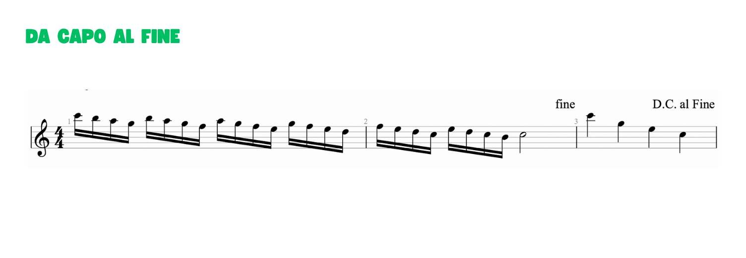 Da Capo al Fine (D.C. al Fine): Quando si incontra questa dicitura alla fine di una sezione, significa che si deve ripartire dall’inizio del brano e suonare fino al punto in cui è indicato il simbolo “Fine” (fine). Il “Fine” non coincide necessariamente con la fine della riga, ma può essere posizionato in qualsiasi punto del brano.