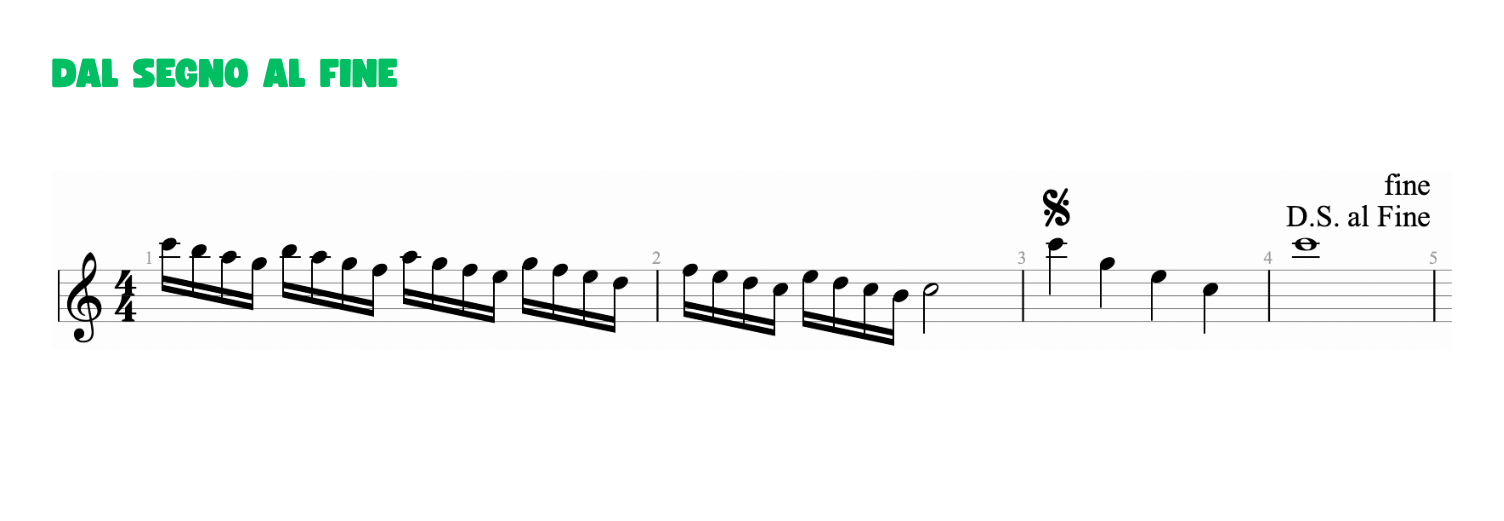 Dal Segno al Fine (D.S. al Fine): Simile al precedente, ma anziché ripartire dall’inizio, si riparte da un simbolo specifico chiamato “Segno” (che assomiglia a una ‘S’ barrata con due puntini ai lati). Si suona da quel punto fino al simbolo “Fine”.