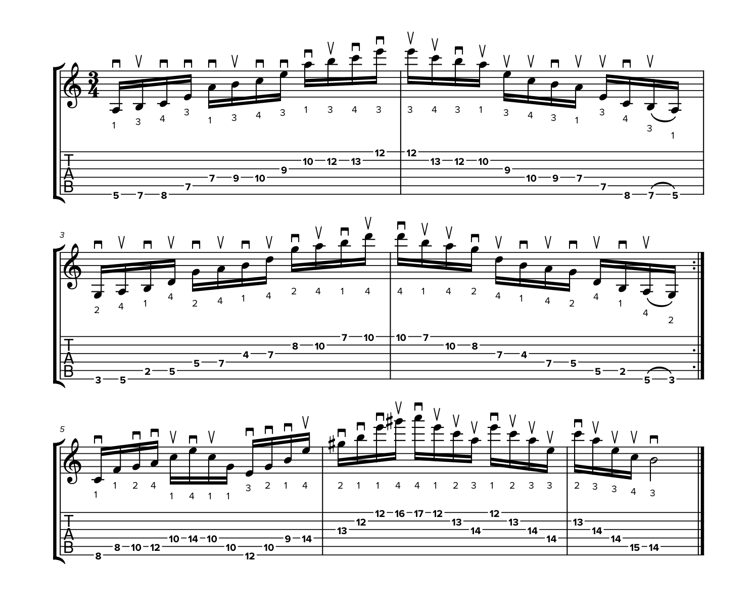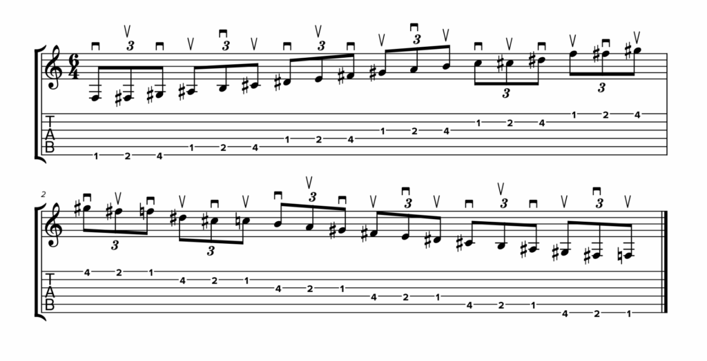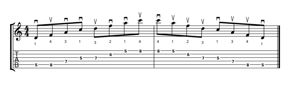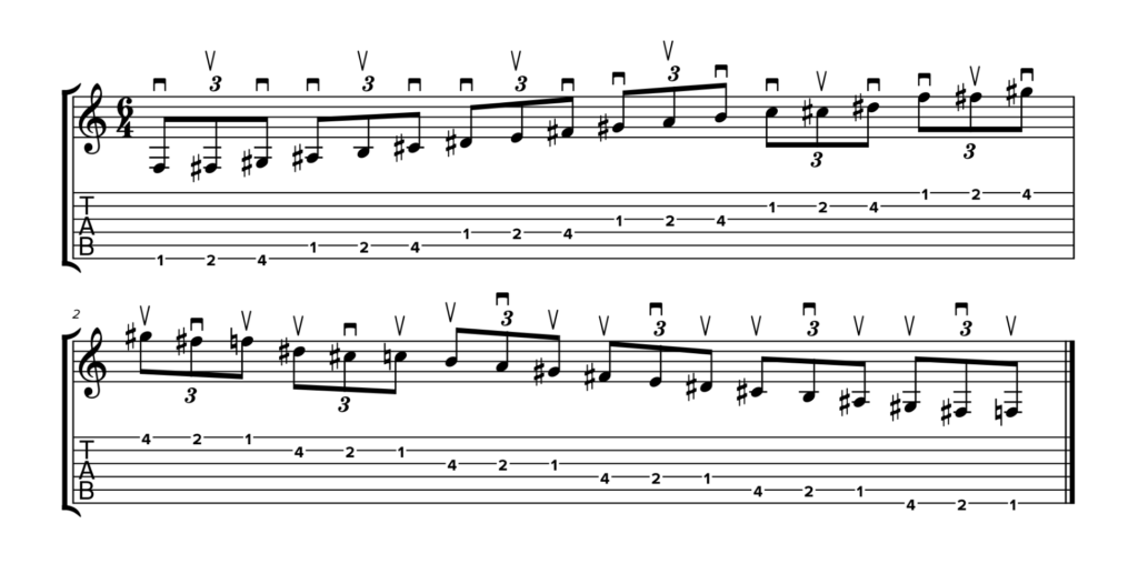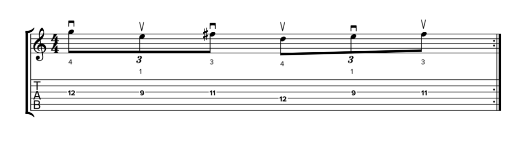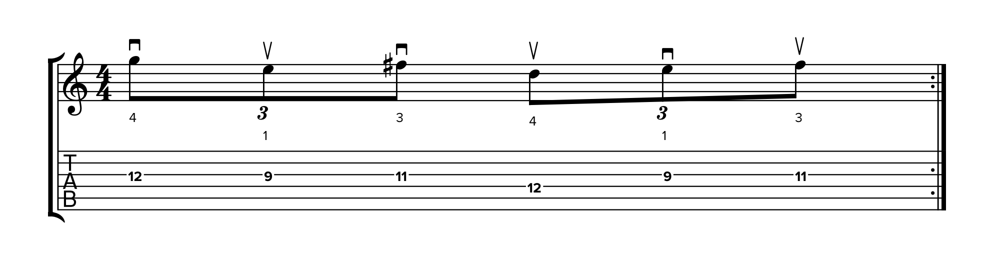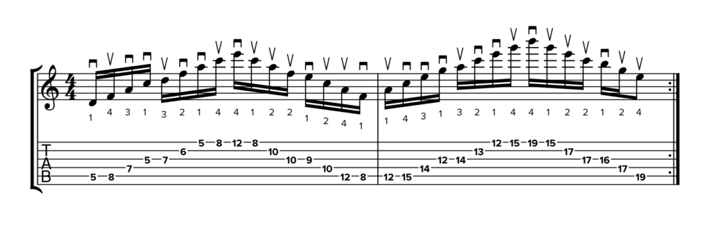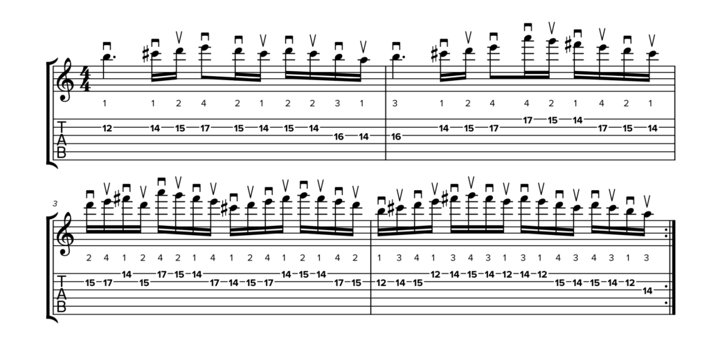 Trovi questi simboli nelle due TAB sottostanti, in cui la diteggiatura rimane identica ma cambia la tecnica di plettrata. Partiamo da un esempio di stretching in plettrata alternata:
