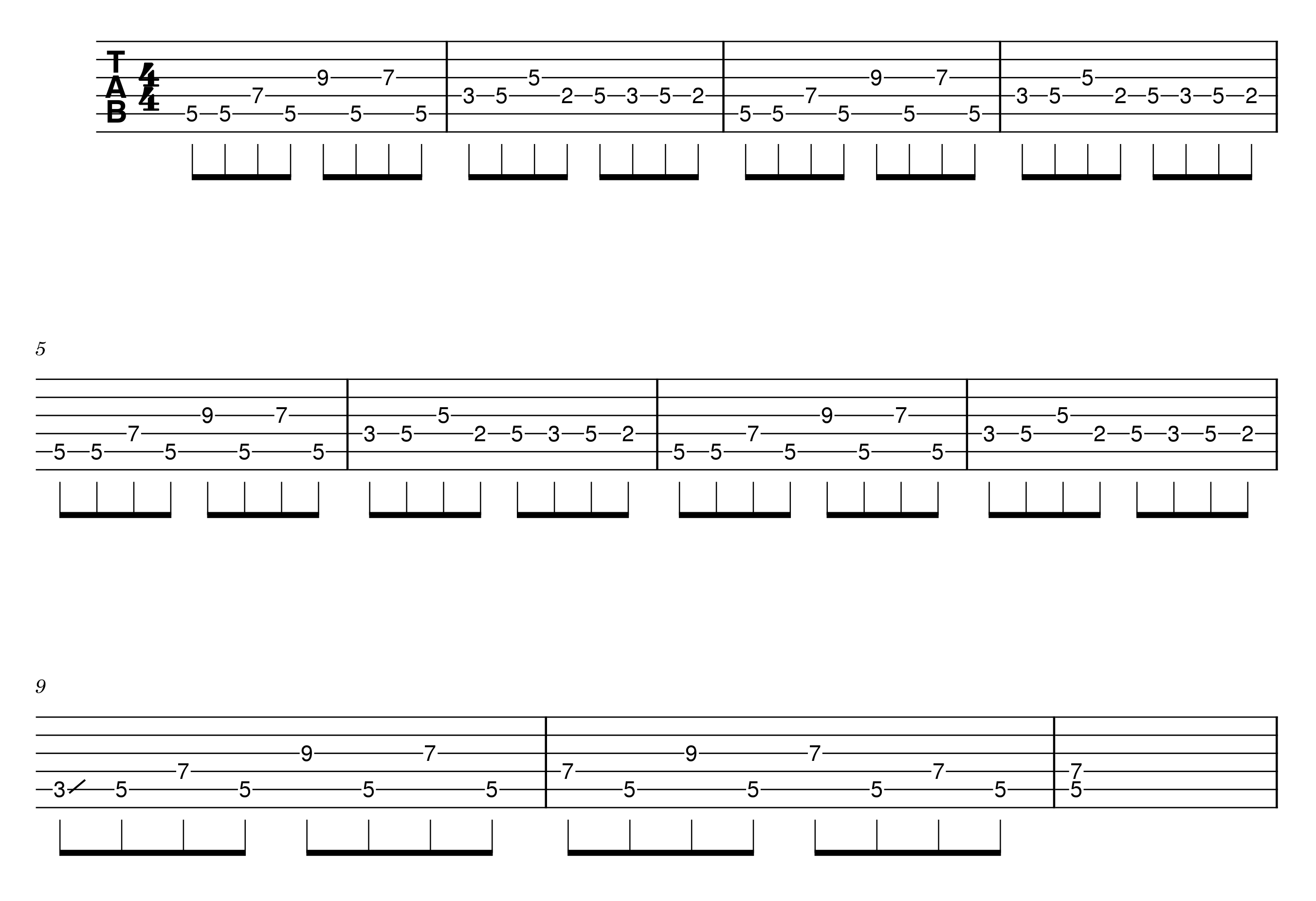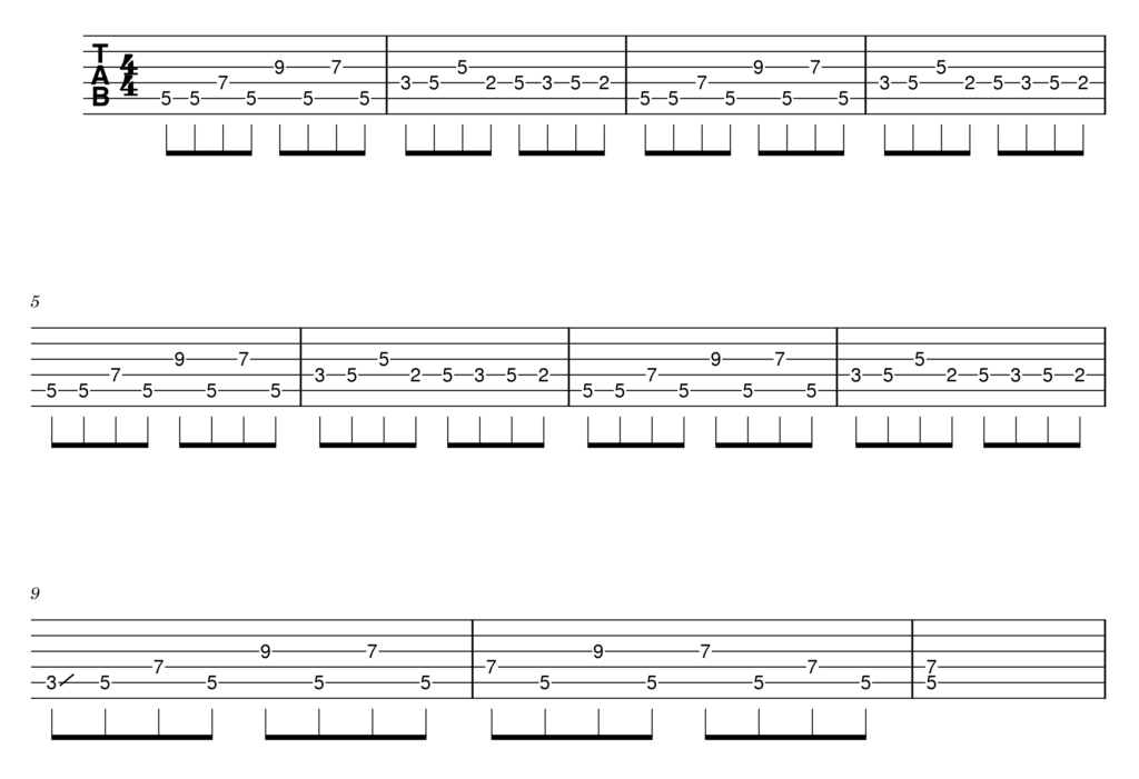 - nelle battute 5-6, 7-8 e 9-10 cambia solo la primissima parte del riff, con il passaggio dal tasto 3 al tasto 5 in slide, ossia la tecnica con il quale facciamo scorrere il dito per raggiungere la nota successiva;