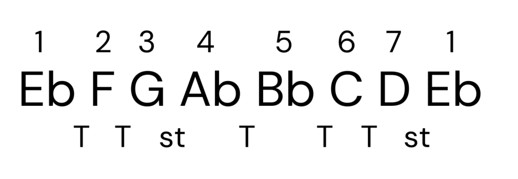 Per l’ultimo esempio partiamo da MIb. Nel caso siano le prime volte che vi approcciate alla costruzione delle scale questa tonalità potrebbe risultare un po’ più complessa, ma non temete! Sfruttando lo schema intervallare e tenendo a mente la scala cromatica, con un po’ di pratica, non avrete alcun problema!