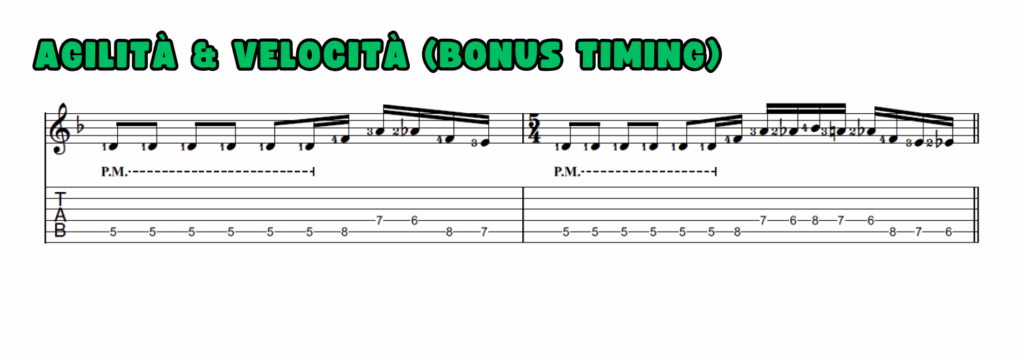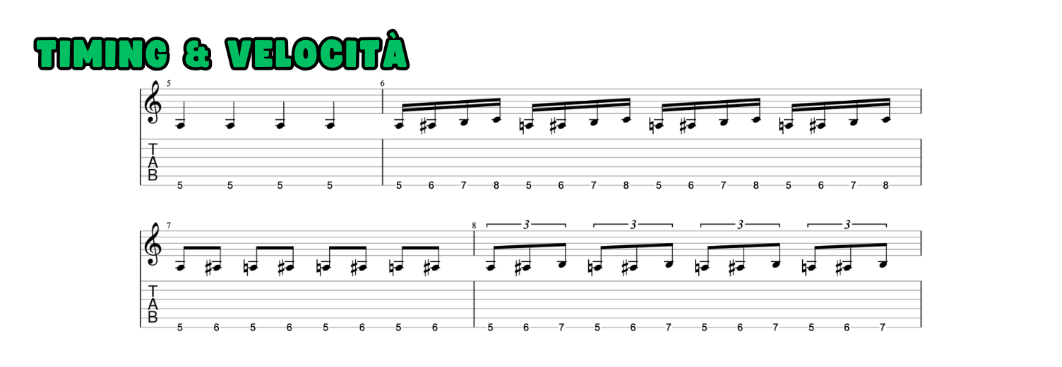 Questo esercizio, pur essendo mirato al timing, può essere utilizzato per aumentare gradualmente il limite di velocità. Essendo composto da una sola battuta per ogni figura ritmica, si può impostare il metronomo a una velocità prossima al proprio limite sui sedicesimi e provare, giorno dopo giorno, ad alzare l’asticella.