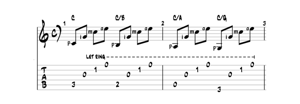 - DO basso LA (C/A): Togliamo anche il dito medio. Il basso sarà la corda di LA a vuoto. Questo accordo è un DO6, può ance essere visto come un LAm7, ma nel contesto dell’esercizio lo consideriamo un DO con un basso differente, la stessa cosa avviene per l’accordo precedente.