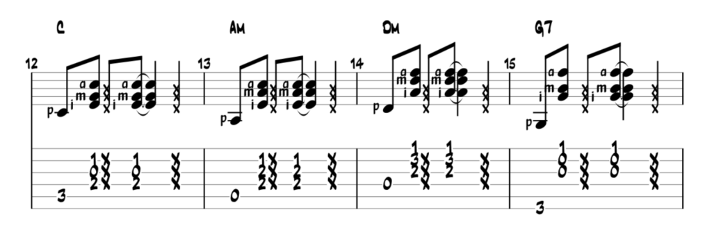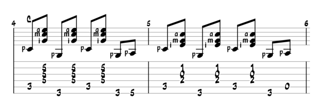 A livello di mano destra la sequenza sarà p, i, m, a, m, i. Noterete quindi che l’arpeggio sale verso l’acuto e poi ridiscende. Cercate di dare un leggero accento sulla prima nota (il basso) e sulla quarta nota (l’anulare) per enfatizzare il ritmo ternario tipico del 6/8 (TA-ta-ta-TA-ta-ta).