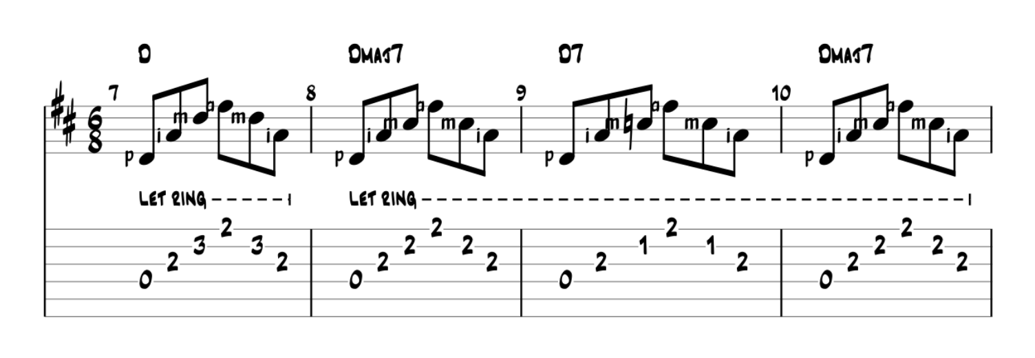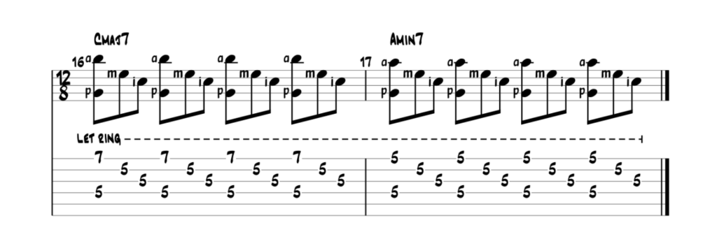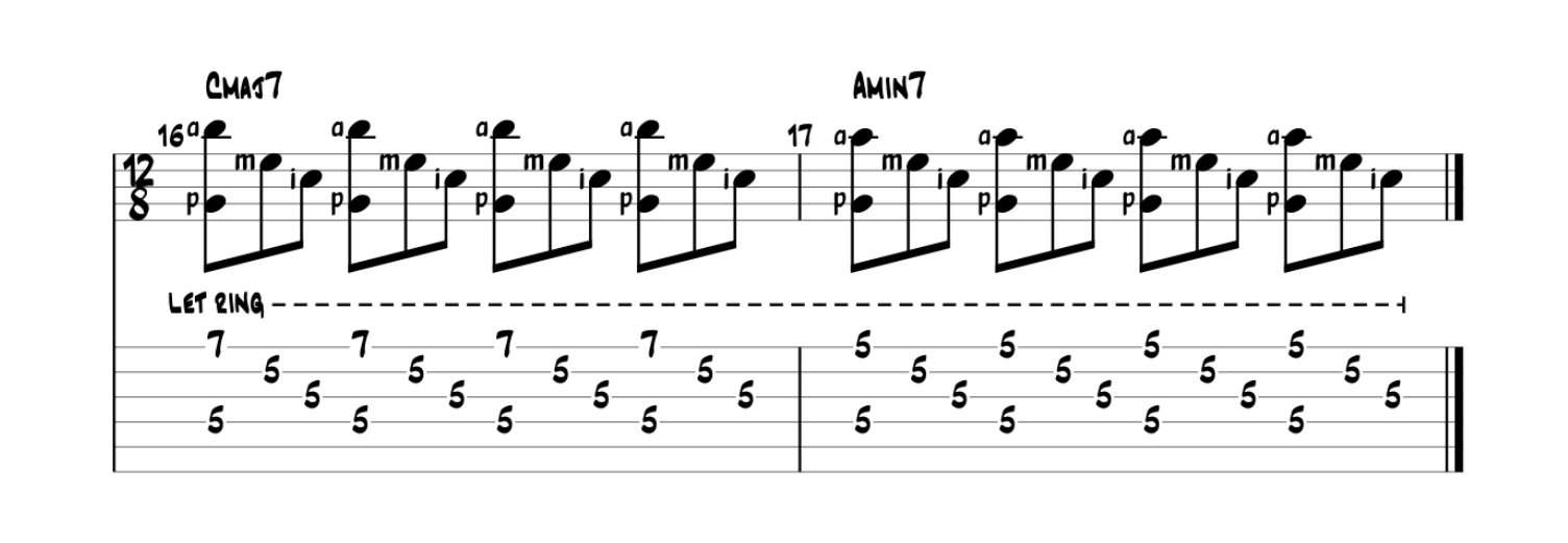 L’ultimo esercizio ci porta in un tempo di 12/8. Qui lavoreremo su accordi più ricchi e su una tecnica di pizzicato armonica.