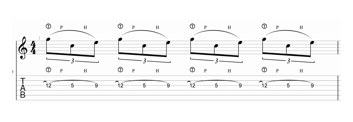 Esecuzione: La sequenza delle note sarà SOL (tapping), DO (mano sinistra), MI (mano sinistra), in successione rapida. Sulla tablatura, il tapping è indicato da una “T” cerchiata e le note sono legate.