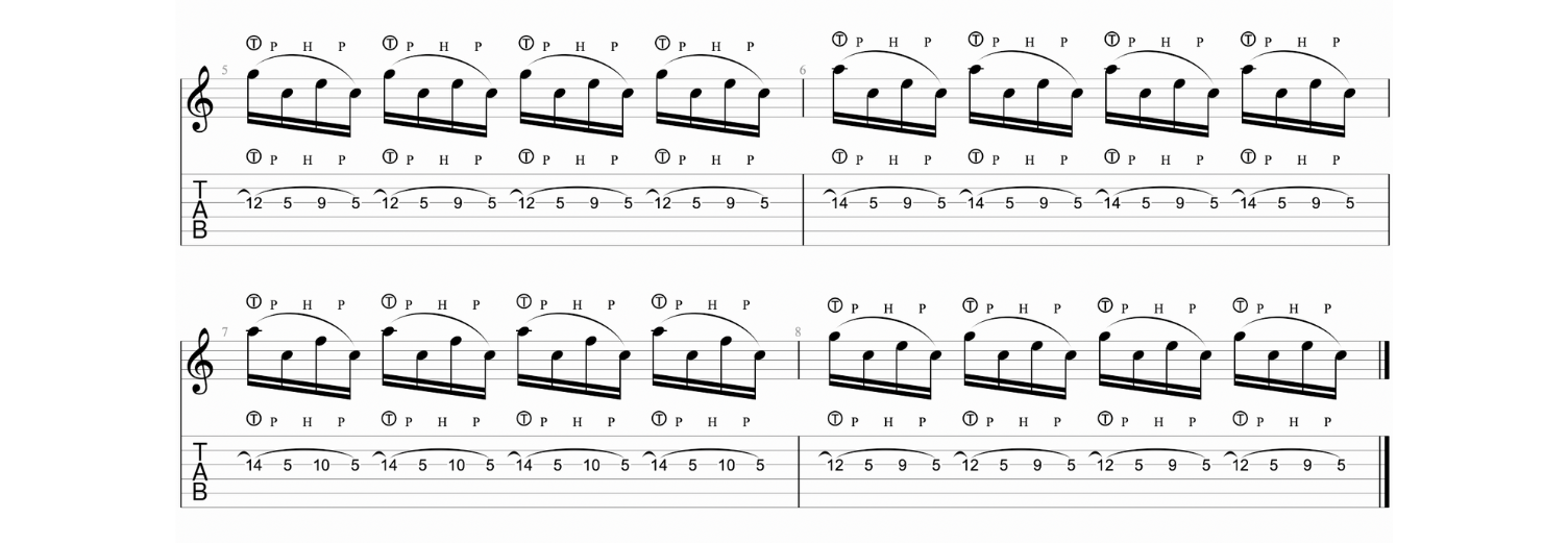 Si parte con l’eseguire in tapping il 12° tasto, per poi completare la pentatonica sulla stessa corda con la mano sinistra. Ad esempio, sulla corda di MI grave: tapping al 12° tasto (MI), poi mano sinistra 5° tasto (LA), 8° tasto (DO). Successivamente ci si sposta sulla corda successiva, continuando il pattern.