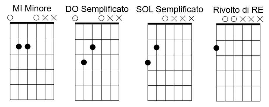 Qui iniziamo a usare più dita della mano sinistra e a dare forma a qualcosa che è a tutti gli effetti già un accompagnamento vero e proprio. Ecco quindi gli schemi degli accordi che dovrai utilizzare.
