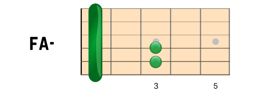 FA minore (Fm): Si tratta di una variazione del FA maggiore visto in precedenza. La posizione è identica, ma dovrai rimuovere il dito medio dalla tastiera. Fai un barrè al primo tasto su tutte e sei le corde con l’indice, poi posiziona l’anulare e il mignolo sul terzo tasto delle corde di LA e di RE.