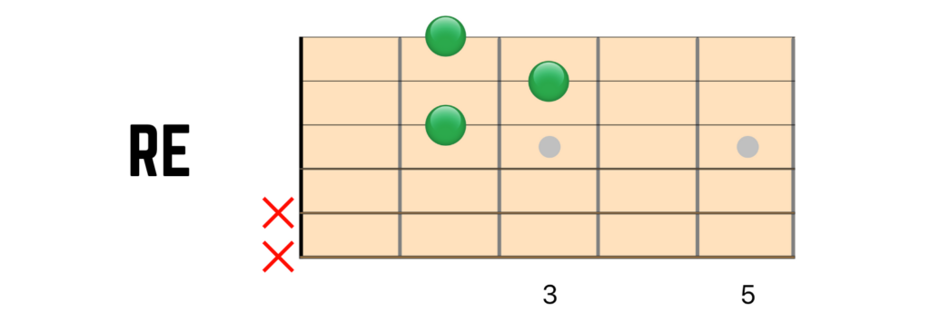 Per eseguire il RE posizionerai l’indice al tasto 2 della corda di SOL, l’anulare al tasto 3 della corda di SI e il medio al tasto 2 della corda di MI cantino. Eseguirai a vuoto la corda di RE, non plettrerai la corda di MI grave e LA.