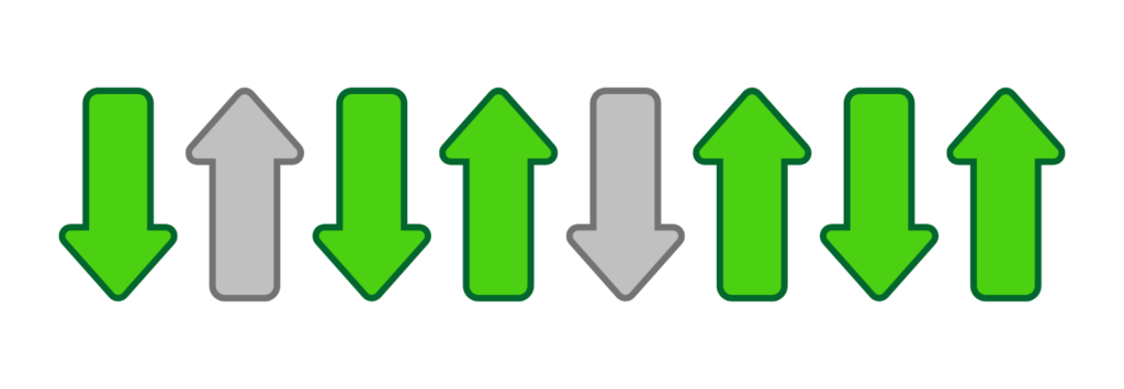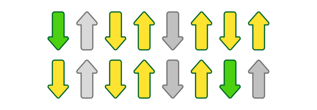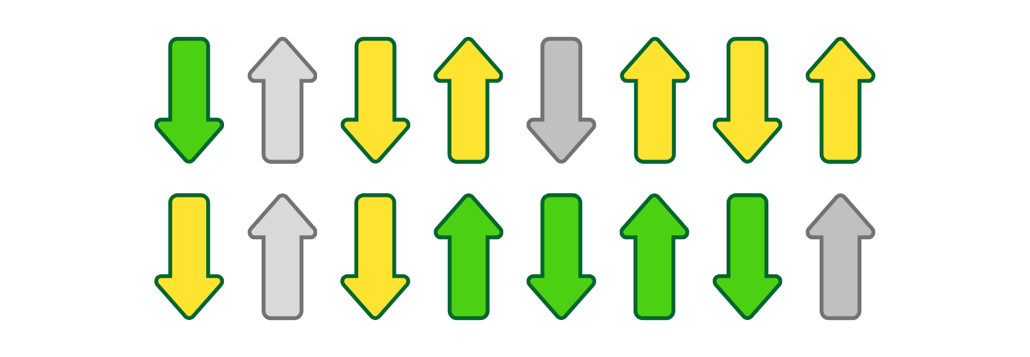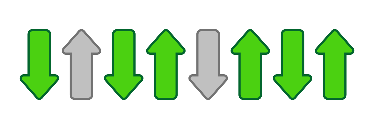 Quando la freccia è verde dovrai eseguire l’accordo vero e proprio, in questo caso LA5 per la prima freccia verde dell’immagine superiore e SOL5 per l’ultima. Nella seconda immagine, invece, la prima freccia verde prevederà sempre l’esecuzione di LA5, mentre le ultime 4 un’alternanza tra SOL5 e LA5.