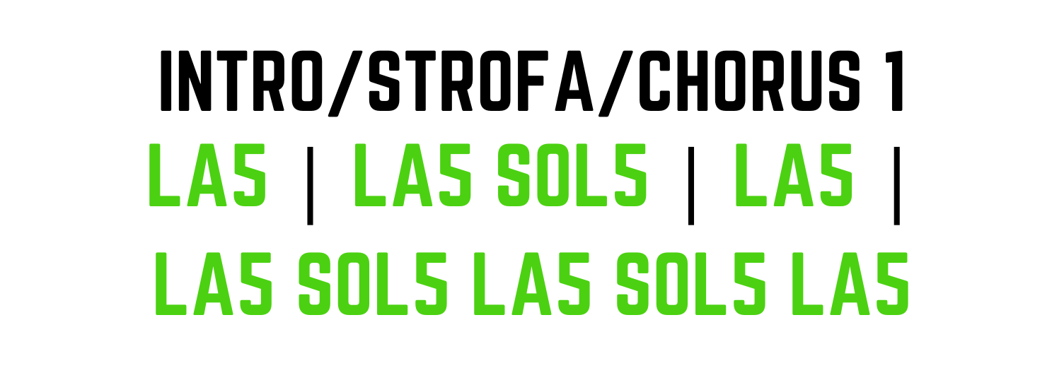 Come detto per la prima ritmica proposta, nell’intro, nella strofa e nel primo ritornello ci limiteremo ad alternare i power chord di LA e di SOL, oltre all’utilizzo delle note stoppate.