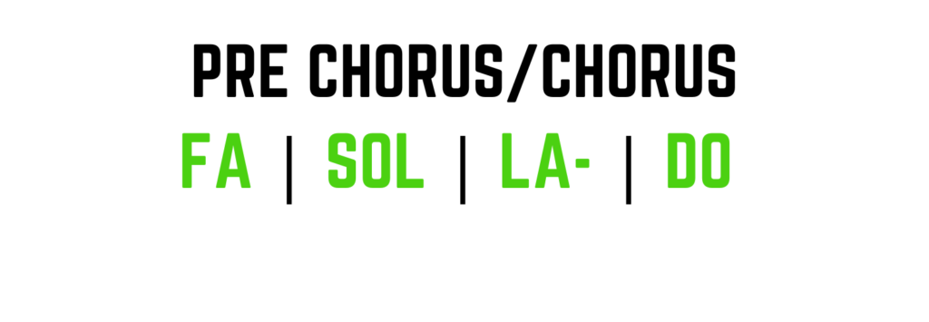 Nel pre ritornello, e per i ritornelli successivi al primo, eseguiremo una battuta di FA, una di SOL, una di LA minore e una di DO.