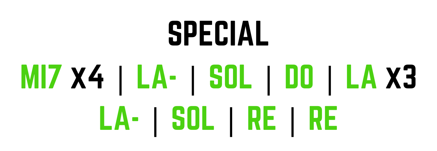 Lo special è la parte più “varia” del brano. Partiamo con quattro battute di MI7, che serviranno proprio a lanciare lo special. Successivamente ripeteremo per 3 volte la progressione LA minore, SOL, DO e LA Maggiore.