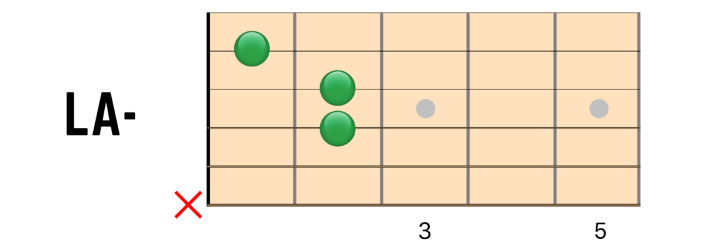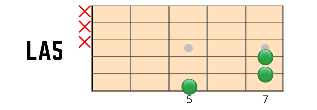 Per eseguire il LA5 posizionerai l’indice al tasto 5 della corda di MI e l’anulare e il mignolo al tasto 7 delle corde di LA e RE. Non dovrai plettrare le altre corde.