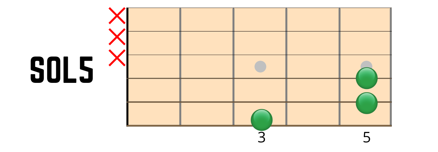Per il SOL5 dovrai semplicemente trasportare indietro di 2 tasti l’accordo precedente, avrai quindi l’indice al tasto 3 della corda di MI e l’anulare e il mignolo al tasto 5 delle corde di LA e RE.