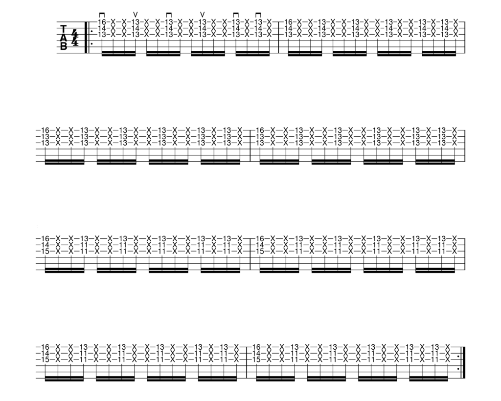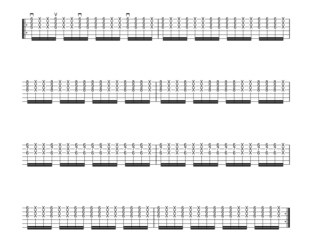 La velocità del brano è di circa 100BPM, per cui nel caso tu sia alle prime armi con la ritmica in sedicesimi, ti consiglio di allenare le due ritmiche con calma: