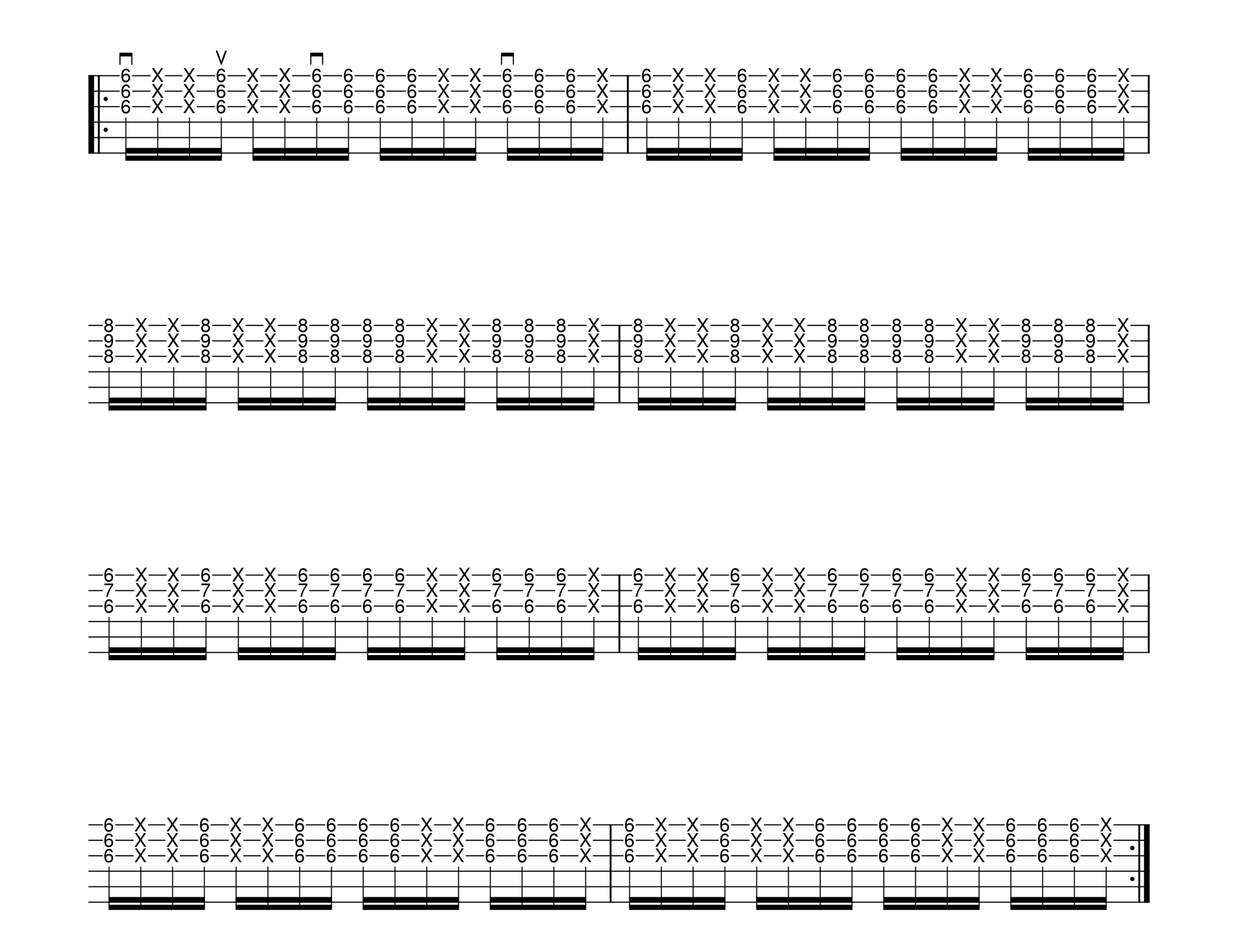 - Il pattern di plettrata ricomincia identico ad ogni battuta (motivo per il quale ho indicato le pennate solo nella prima);