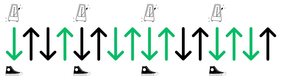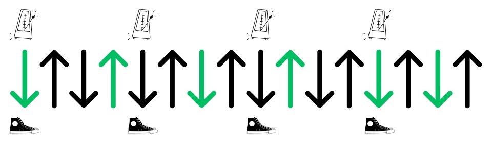 Ecco infine lo schema con le frecce. Oltre all’indicazione per battere il piede a tempo, ti ricordo che la freccia verde indica quando suonare le note e la freccia nera quando stopparle (ghost notes).